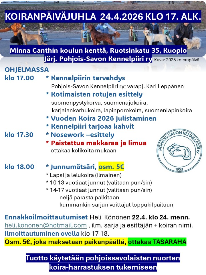 Valtakunnallinen Koiranpäiväjuhla lähestyy. Se järjestetään tänä vuonna 24.4. klo 17.00 alkaen Kuopiossa Minna Canthin koulun kentällä (os. Ruotsinkatu 35, Kuopio).