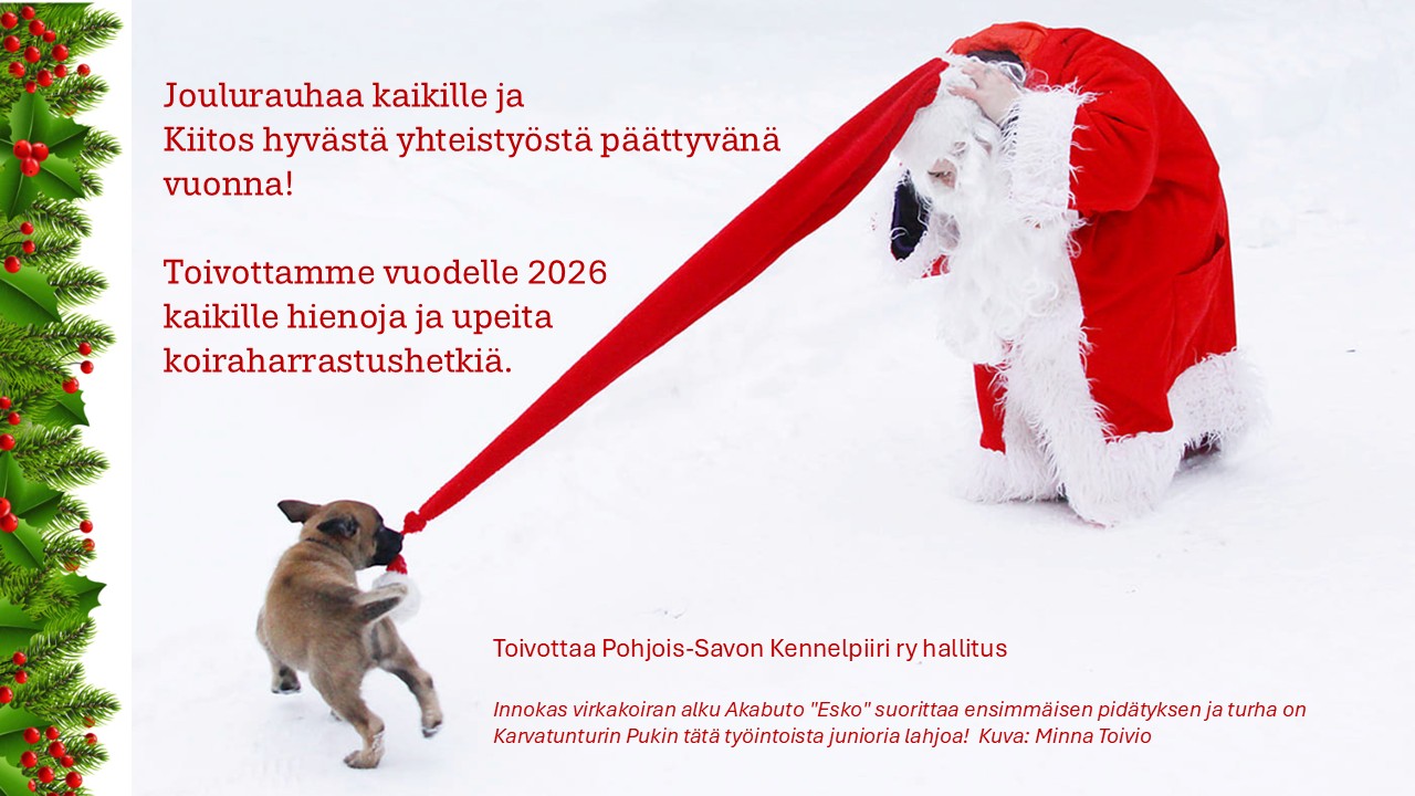 Jäämme kennelpiirissä Joulunviettoon. Palaamme sorvin ääreen jälleen loppiaisen jälkeen. Sihteeri päivystää akuuteissa asioissa, olkaa häneen tarvittaessa yhteydessä. Kiitos kaikille toimihenkilöillemme ja jaostoillemme sekä jäsenyhdistyksillemme hyvästä yhteistyöstä.Kiitos myös yhteistyökumppaneillemme vuodesta 2025.